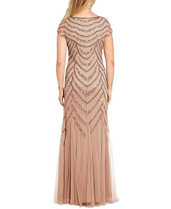 Mesh insets sweep and sway with every step in this compliment-worthy gown from Adrianna Papell, fashioned with shimmery beads and sequins throughout.
