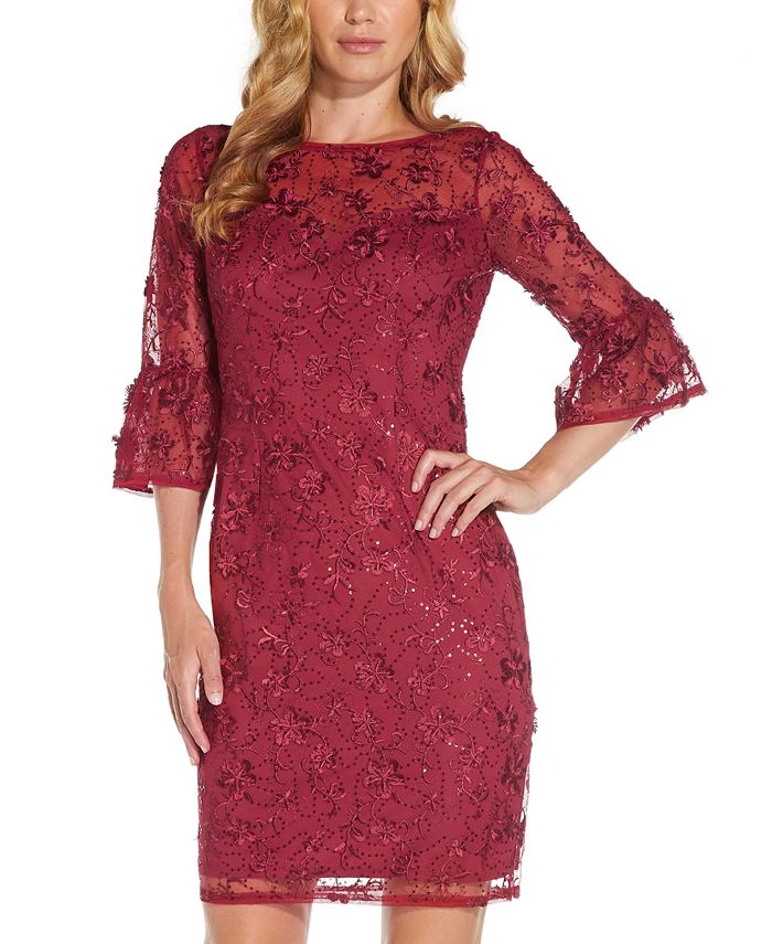 Effortlessly elegant, Adrianna Papell’s flattering fit & flare dress is framed by sheer illusion bell sleeves and finished with floral embroidery.