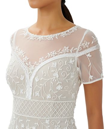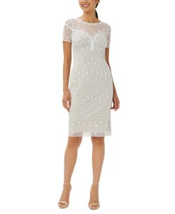 Tonal beads detail a fine mesh overlay on this picture-perfect dress by Adrianna Papell. Strappy heels will make it a fabulous look for a chic cocktail party.