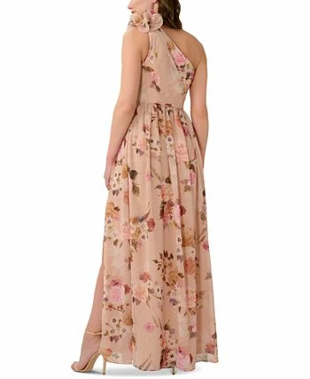 Floral appliqué elegantly finishes Adrianna Papell’s one-shoulder gown, blooming a floral print.