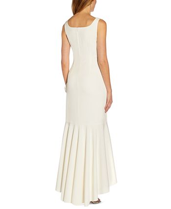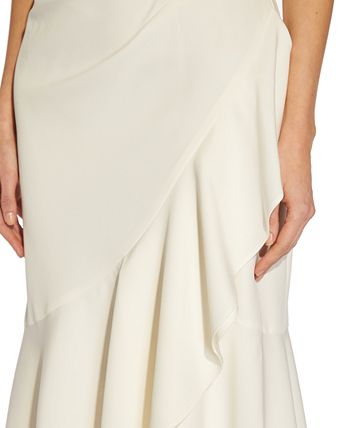 Adrianna Papell’s dramatic high-low gown is styled with a romantic ruffle all the way around the hem.