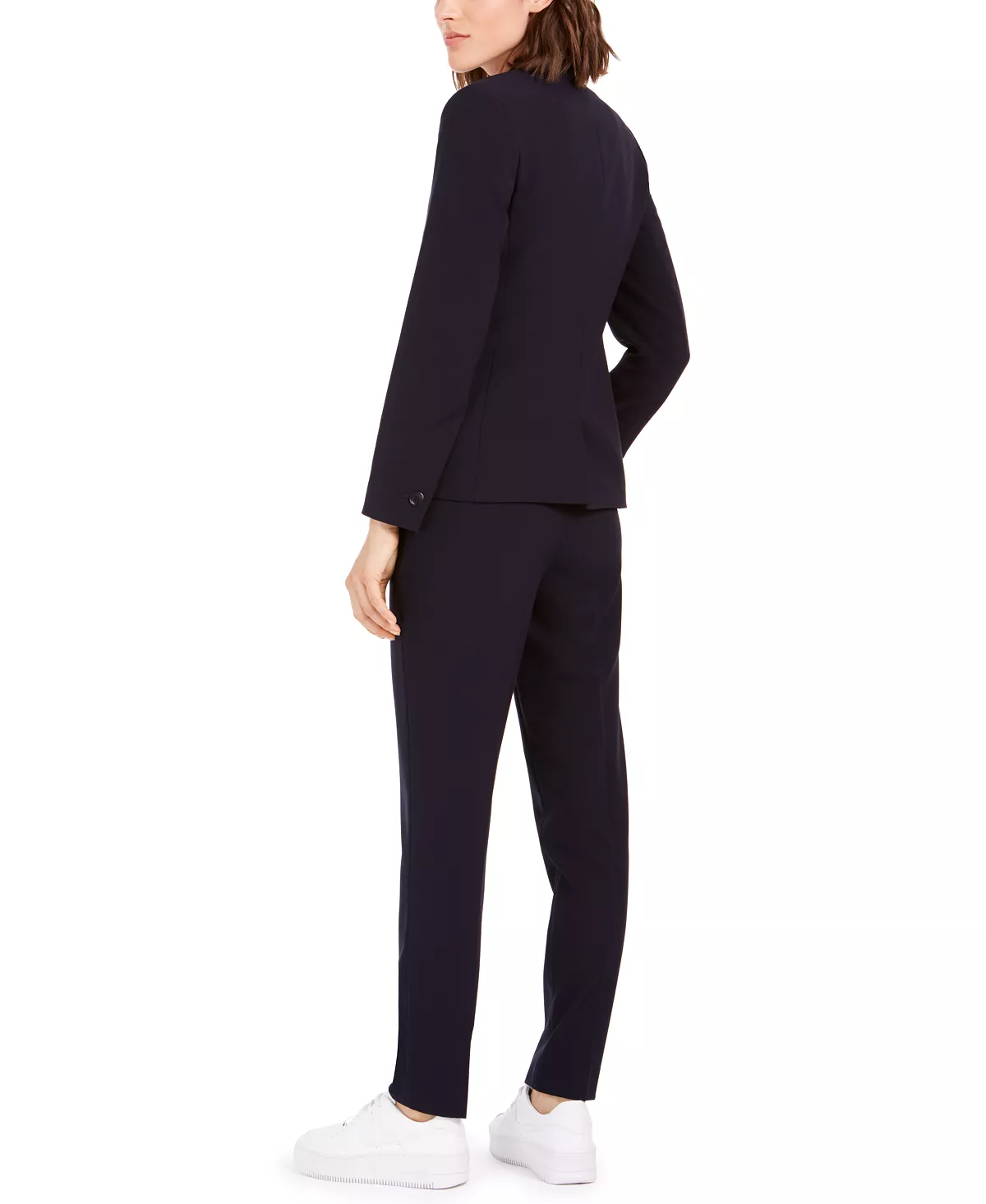 Assemble a sleek office look with Bar III’s collarless jacket, inverted-pleat top and straight-leg pants.