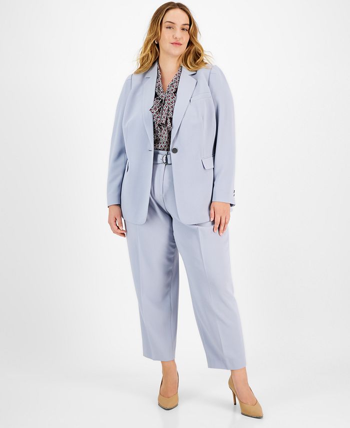 Bar III reimagines the retro-chic work aesthetic with this plus size ensemble, featuring a crepe blazer and matching pants paired with a delightful bow blouse.