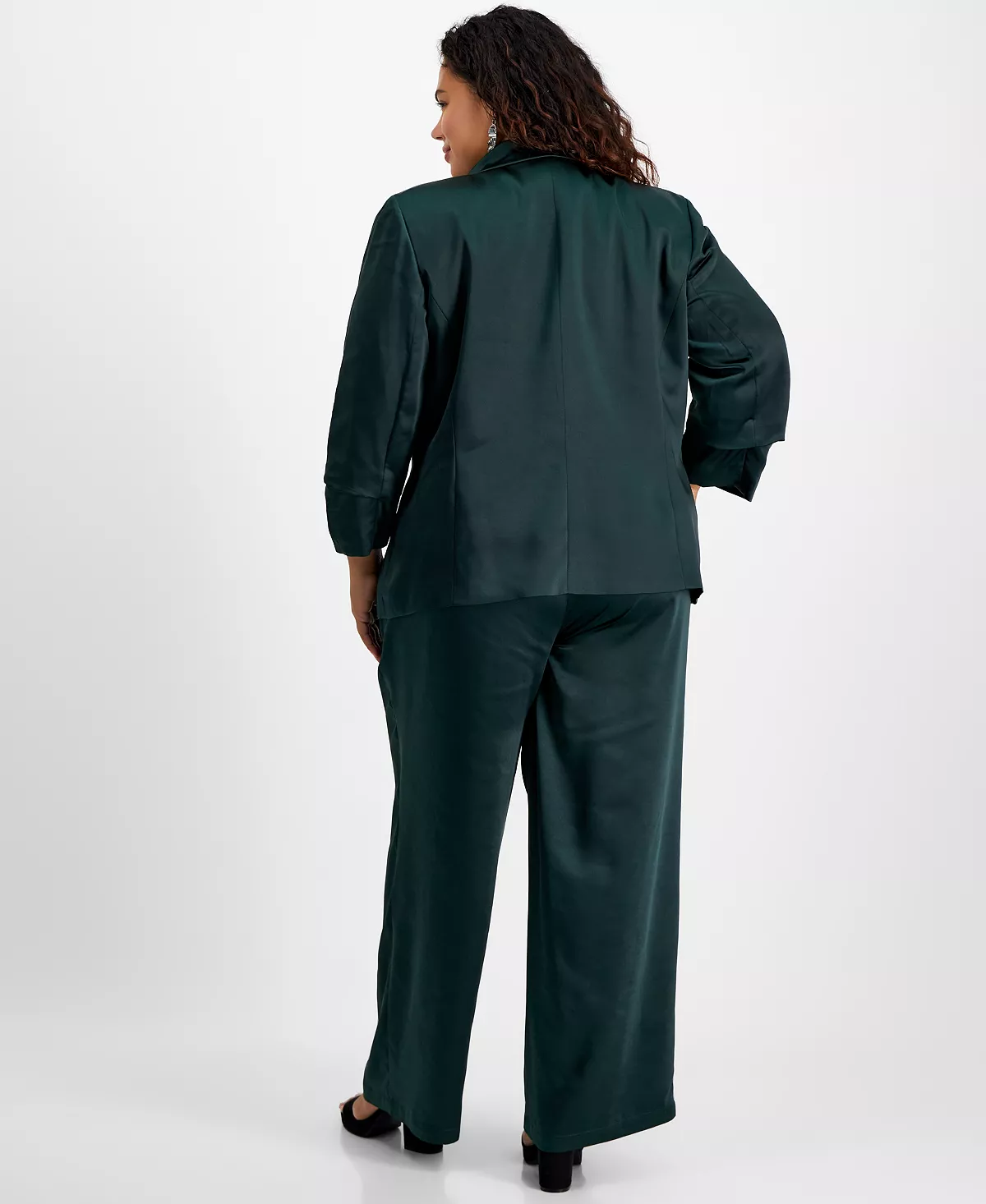 Washed satin dresses up the laid-back details (like pleated sleeves and a drawstring waist) of Bar III’s plus size jacket and pull-on pants to add professional polish to your look.