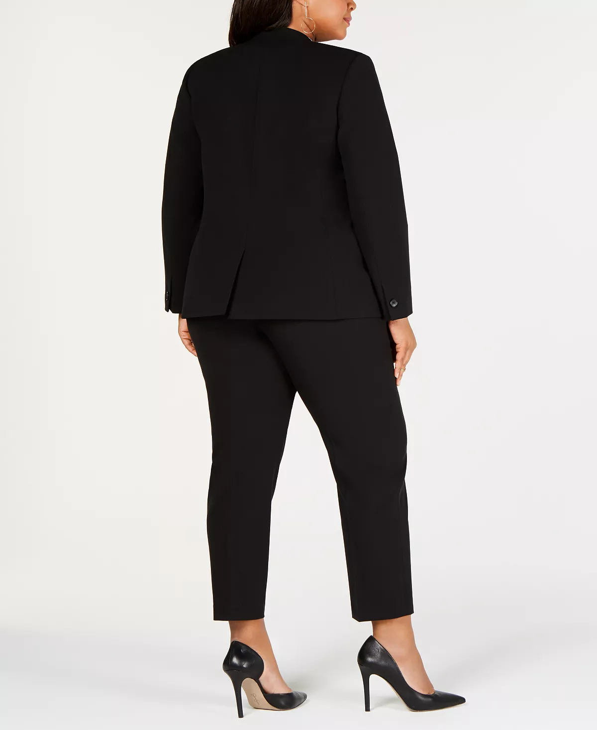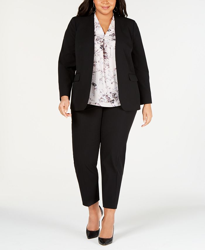 Bar III’s plus size open-front jacket and straight-leg pants offer a contemporary career look, with a printed blouse for interest.