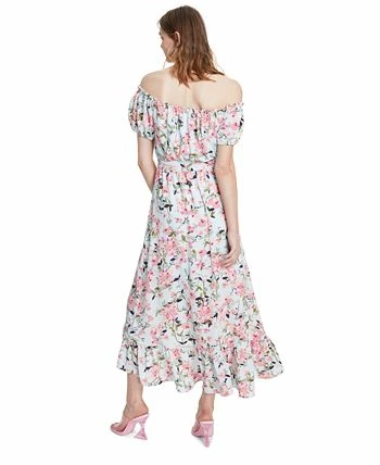 - Off-the-shoulder neckline; Midi silhouette