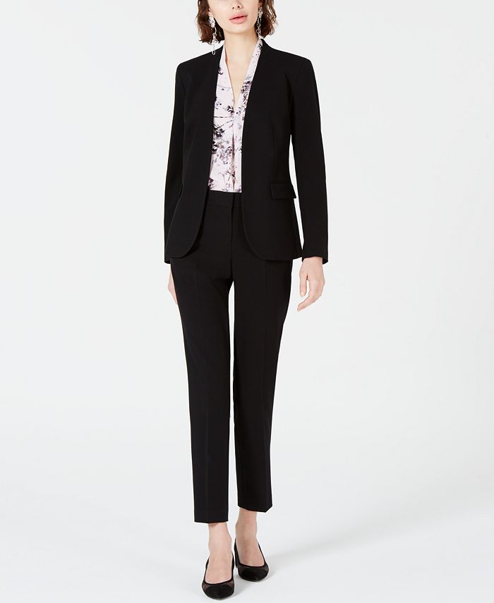 Bar III’s open front jacket and slim pants offer a contemporary career look, with a printed blouse for a touch of personality.
