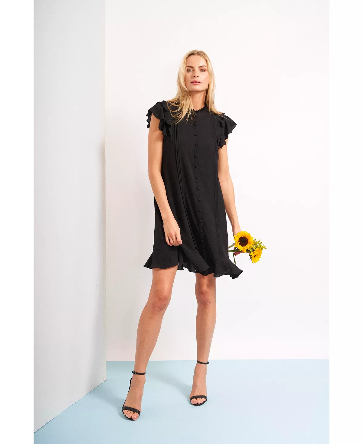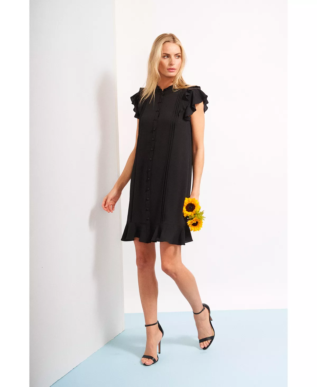 Perfect for any party this season can present, CeCe’s ruffled-hem pintucked dress has a fun finish with short fluttering sleeves and buttons down the front.