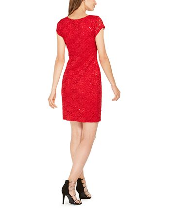 Short cap sleeves flow gracefully into a flattering neckline on this sophisticated cocktail dress covered in sequined lace from Connected.
