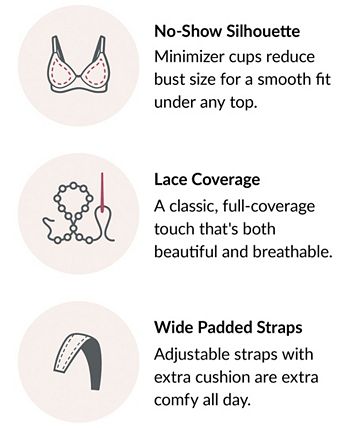 Your clothes will fit and look better with this minimizer. The sophisticated lacey look includes all of the MagicLift features, a wireless inner cushioned band for incredible bust support and great shape. The wide padded straps pamper your shoulders and cotton blend bottom cups wick away moisture for all day comfort.