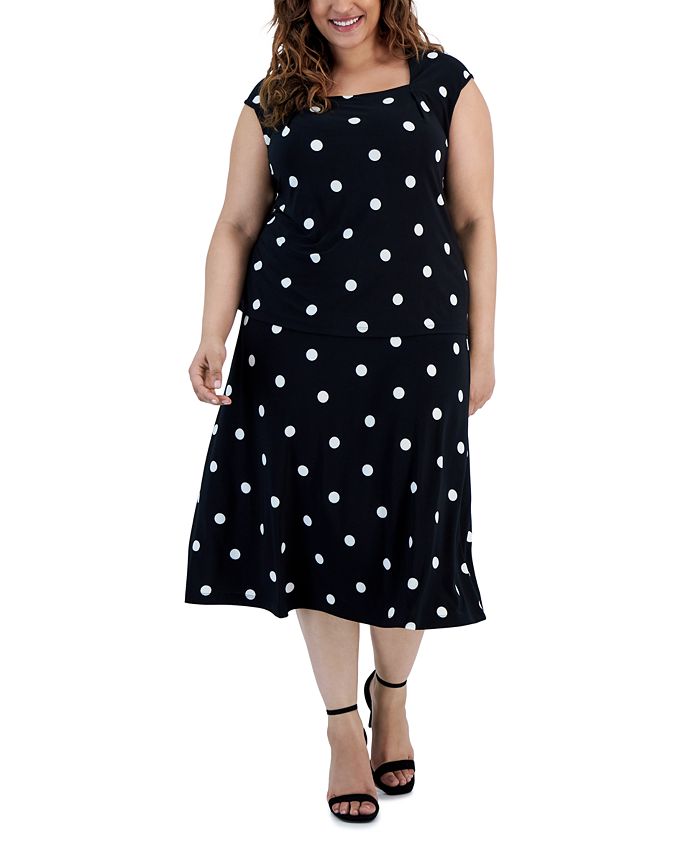 Designed to flatter the plus size figure, Kasper brings printed perfection to your wardrobe with this polka dot midi skirt and cowl neck sleeveless top.