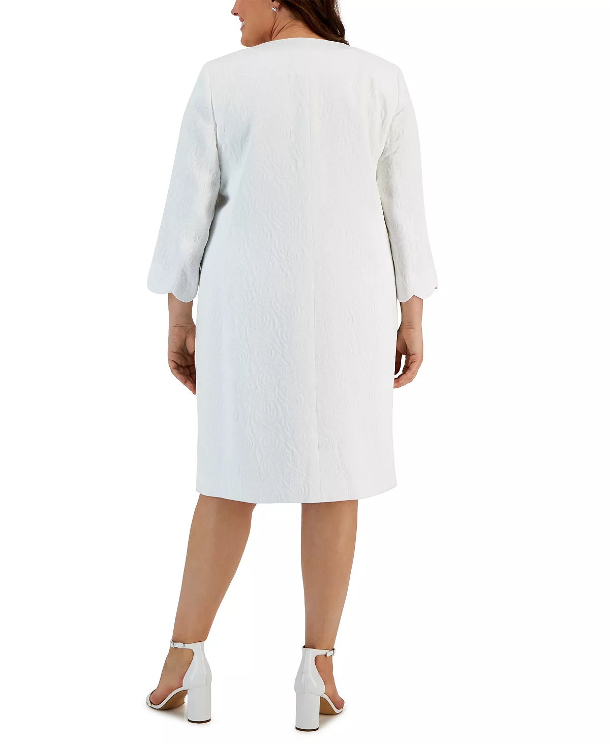 Showcase a chic and polished, professional look with Kasper’s plus size stylish topper over a fashionable empire seamed dress.