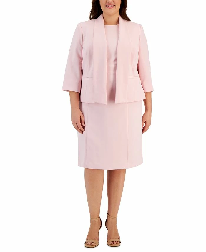 Step into your best professional-look with this polished, plus size open-front blazer over a charming cap-sleeve dress.
