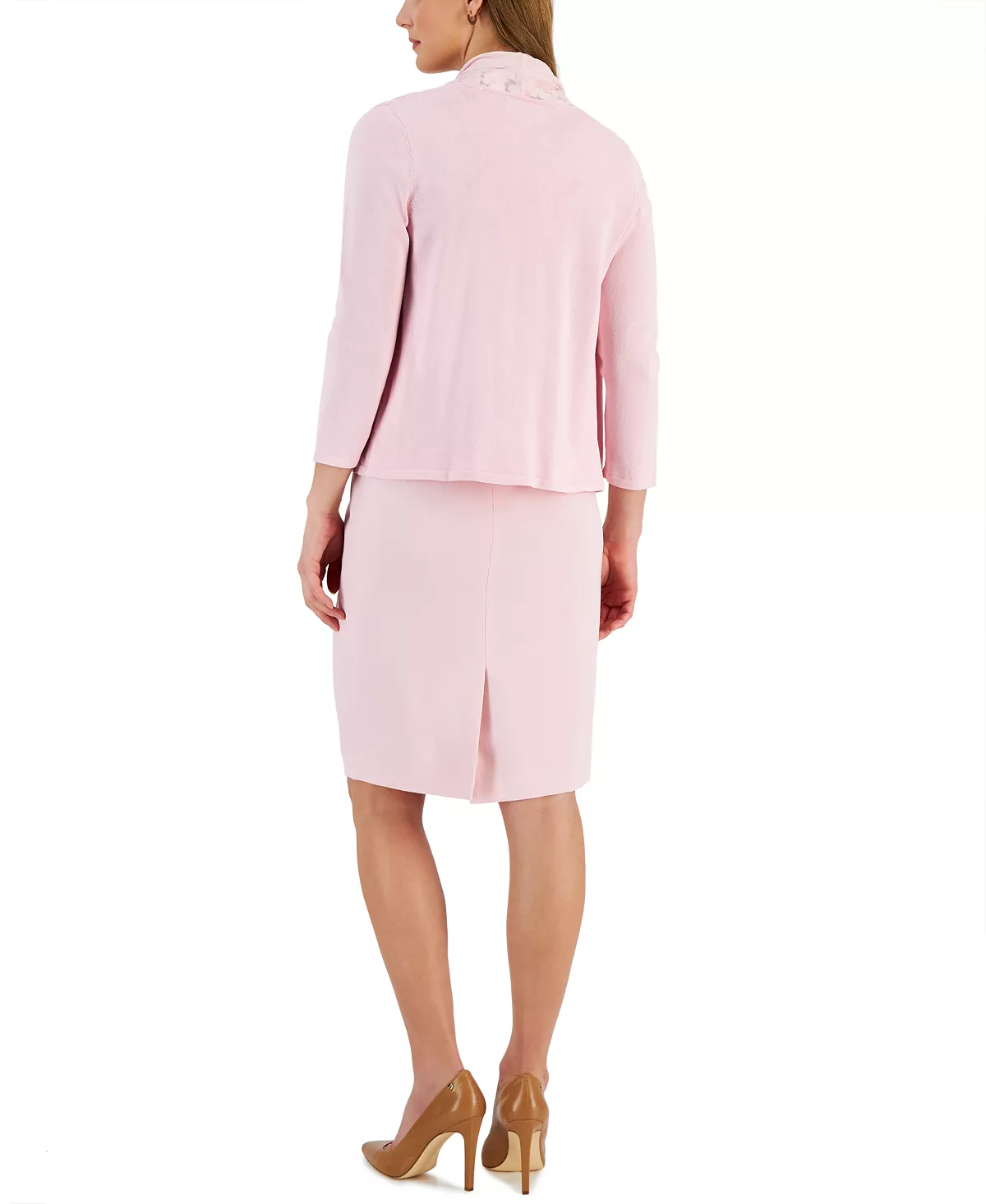 A mix of textures and prints lends depth to Kasper’s suiting separates. A chiffon collar on the cardigan beautifully echoes the fluid drape of a printed cowlneck top.