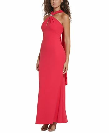Elegantly cascading down the back with a scarf-style tie, Vince Camuto’s sleek sleeveless gown subtly sparkles with an eye-catching rhinestone embellishment at the front halter neckline.